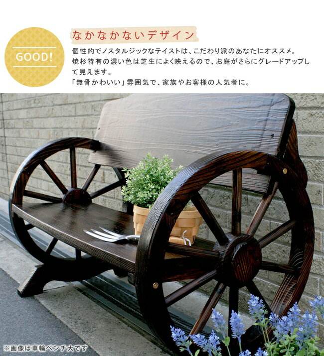 車輪ベンチ&焼杉テーブル3点セット(ベンチ小×2 テーブル×1) WBT650-3PSET-DBR ■商品名車輪ベンチ&焼杉テーブル3点セット (ベンチ小×2 テーブル×1) ■型番 WBT650-3PSET-DBR ■カラー ダークブラウン ■サイズ 【車輪ベンチ小】 本体:幅 約655×奥行 約580×高さ 約815mm 座面高さ:約385mm 【焼杉テーブル】 本体:幅 約1100×奥行 約550×高さ 約480mm 座面高さ:約480mm ■重量 【車輪ベンチ小】約12.5kg【焼杉テーブル】約12.2kg ■材質 天然木(杉・松) ■仕上げ ラッカー塗装 ■組立区分 組み立て式